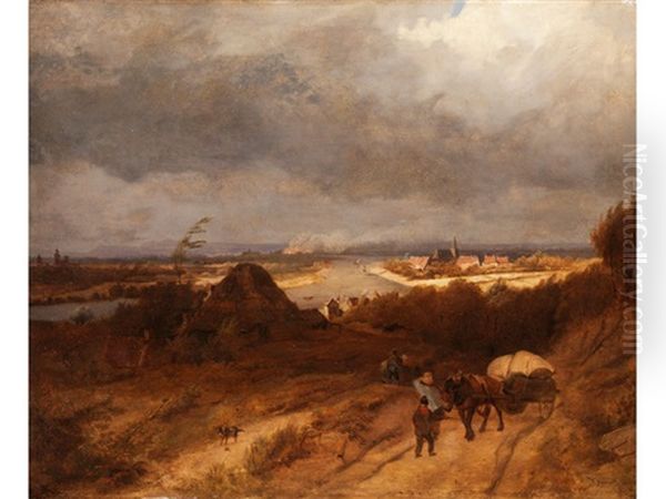 Landschaft Mit Blick Auf Ein Stadtchen Am Fluss Und Pferdekarren Im Vordergrund