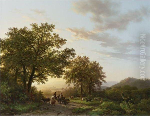 Travellers With Cattle And Donkeys On A Sunlit Path In A Rhenishpanoramic Landscape