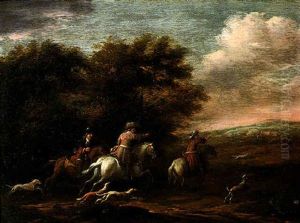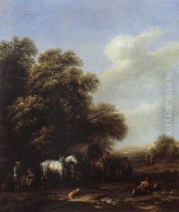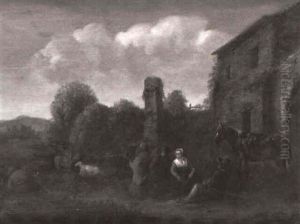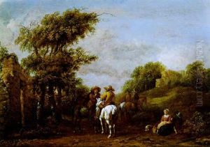 A Landscape With Horsemen Resting By A Fountain