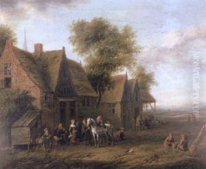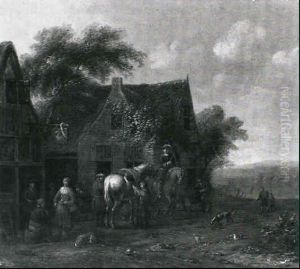 A Horseman And Various Figures Standing Outside A Tavern