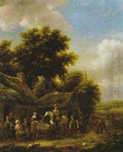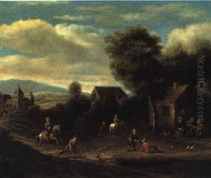 A Village Landscape With Travellers And A Wagon By An Inn