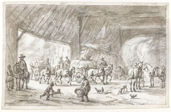 Interior Of A Barn, With Figures, Horses And Carts