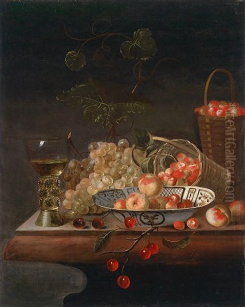Ein Stillleben Von Trauben, Einem Romer, Einer Wan-lischale Und Fruchten Auf Einer Steinplatte