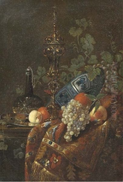 Oranges In A Wanli Kraak Porselein Bowl, A Peach And Nuts On A Silver Plate, A Glass Vessel Of Wine, A Gilt Cup And Cover And White And Black Grapes