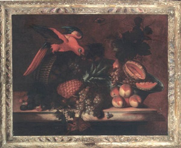 Still Life Of An Overturned Basket Of Fruit, A Parrot, And A Blue And White Porcelain Bowl On A Ledge