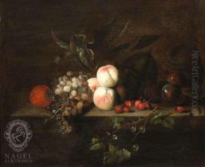 A Still Life Of Peaches, A Carafe, A Glass And Grapes, All Arranged Upon A Ledge
