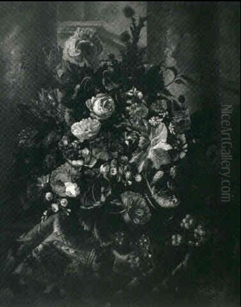 Roses, Carnations, Morning Glory And Other Flowers In An Urn On A Draped Ledge With Grapes And A Parakeet