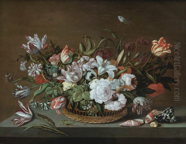 Flowers in a Basket on a Ledge with Shells