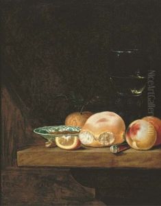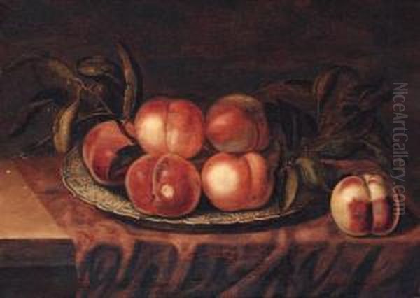Peaches On A Porcelain Dish, On A Partially Draped Ledge