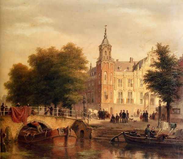 A Sunlit Townview With Figures Gathered On A Square Along A Canal