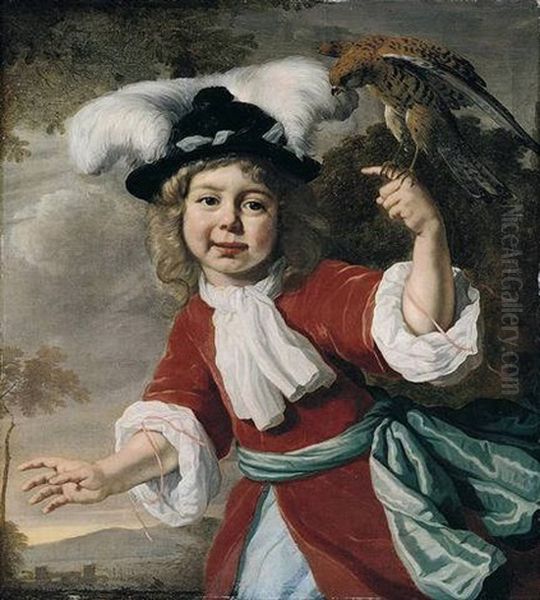 Portrait Of A Young Boy Wearing A Red Coat Tied With A Pale Blue Sash And A Feathered Hat, Holding A Kestrel, A Landscape Beyond