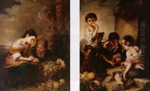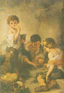 Two Peasant Children Seated Amonst Ruins, Counting The Money They Have Raised From The Sale Of Fruit