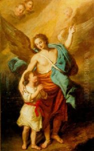 Saint Joseph Taking The Hand Of The Christ Child With A Glory Of Angels Above