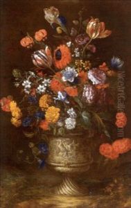 Tulips, Roses, Carnations, Morning Glory, Narcissi And Other Flowers On An Urn On A Plinth