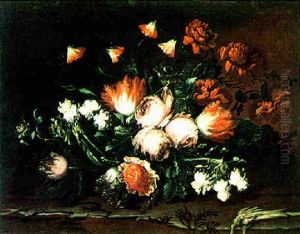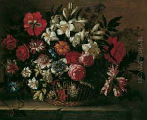 Still Life Of Various Flowers In A Wicker Basket, Upon A Stone Ledge