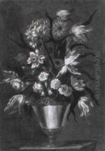 Still Life Of Flowers In An Ornamental Urn On A Stone Ledge