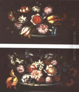 Still Life Of Roses, Tulips, Irises, Morning Glory, Chrysanthemums And Carnations Adorning A Stone Niche, With Insects Surrounding An Image Of The Virgin And Child (+ Still Life; Pair)