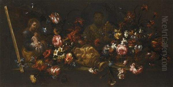 Still Life Of An Upturned Vase Of Flowers, With A Canvas Painting Showing Saint Joseph Holding The Christ Child, And Another Showing Saint Nicolas Of Bari Oil Painting by Bartolome Perez