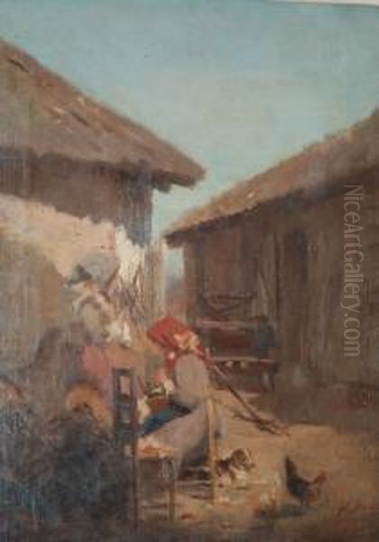 "contadine Nell'aia " Olio Su Tela