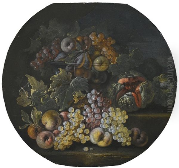 Still Life Of Grapes, Apples, Pears, A Watermelon And Peaches, In A Glass Bowl And Strewn Over Stone Steps