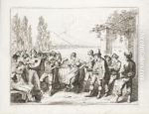 Un Couple Dansant Le 'saltarello', Entoure De Musiciens; Et Des Femmes Et Des Enfants Se Recueillant Devant Une Chapelle Eclairee A Tivoli