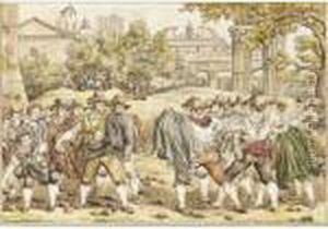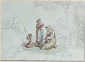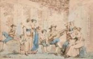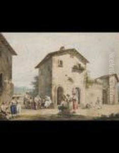 A Group Of Seven Watercolours Of Roman Scenes: Peasants Worshipping At A Shrine; A Punch And Judy Show; A Family Playing With Children; Peasants On A Road; A Tavern Scene; Washerwomen; Musicians Serenading