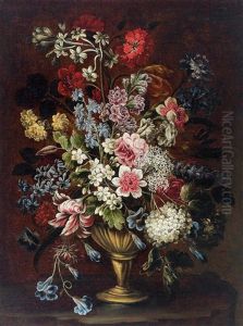Celoria Cristata Red Velvet, Tulips, Roses, Poppies, Carnations, Lilies, Hyacinths, Morning Glory And Other Flowers In A Sculpted Urn...