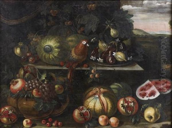 Nature Morte Aux Pasteques, Plat De Figues, Grenades, Et Perroquet