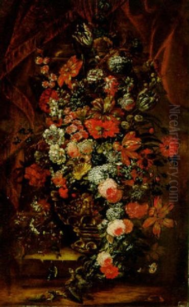 Tulipani, Campanule, Peonie, Narcisi E Altri Fiori In Un Vaso A Relievo Su Un Piedistallo Di Pietra