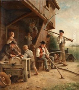 Allmogeinterior Med Tva Flickor Som Gor Morgontoilet Och Kvinna Som Maler Kaffe
