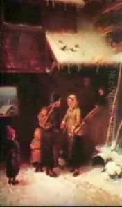 Vinterlandskap Med Barn Och Hund Vid Kallarbyggnad