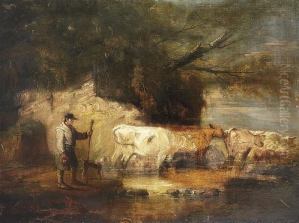 A Herdsman Droving Cattle And Sheep In A River Landscape