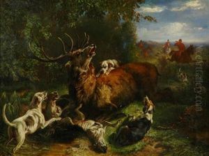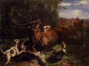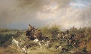 Hounds Resting In A Woodland Clearing With Huntsmen Beyond