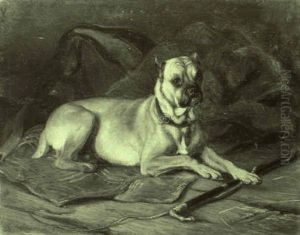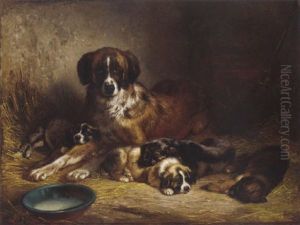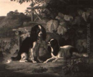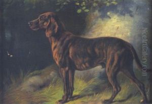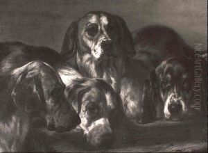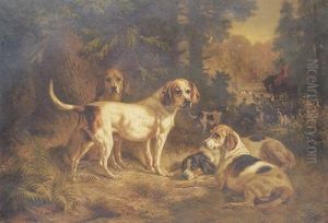 Hounds Resting In A Woodland Clearing With A Huntsman Beyond