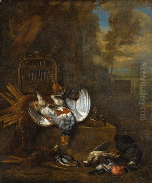 Hunting still life with a dead pheasant and songbirds in a landscape