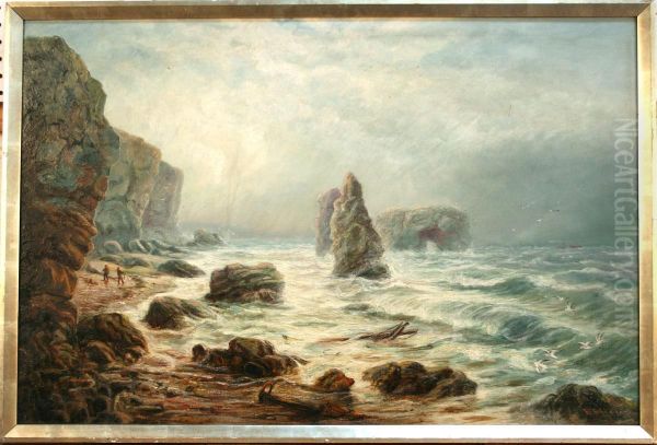 Rocky Coastal View With Twofisherman Hauling In Nets