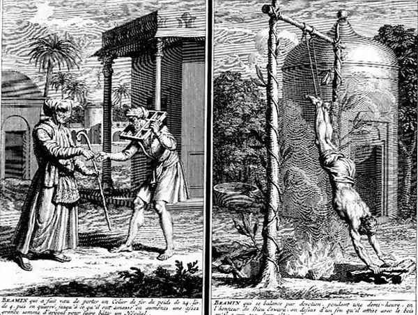 A Brahmin who wears an iron collar to raise funds for a hospital and a Brahmin suspended over a fire in devotion, illustrations from Religious Ceremonies and Customs, c.1724