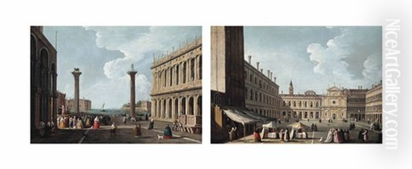 The Piazza San Marco, Venice, Looking West Towards San Geminiano (+ The Piazzetta, Venice, Looking South, With The Columns Of Saints Mark And Theodore And The Biblioteca Marciana; Pair)