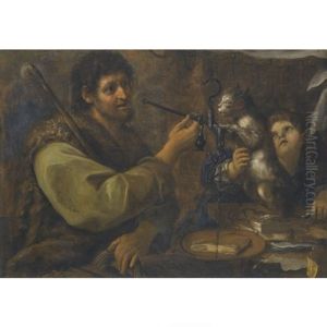 A Shepherd Weighing A Slice Of Ham, Beside A Cat And A Young Boy