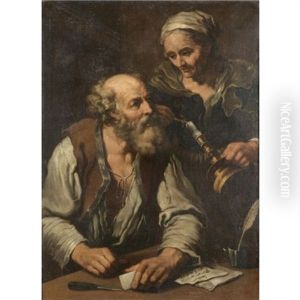 An Interior With An Elderly Lady Holding A Candle Looking Over The Shoulder Of An Elderly Gentleman Seated At A Table