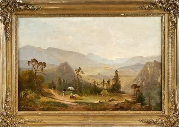 Maler Vor Seiner Staffelei In Romantischer Gebirgslandschaft Mit Weitem Blick Auf Den Tal Mit Siedlung