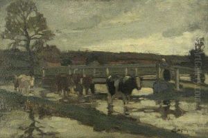 Cattle Crossing A Ford At Twilight