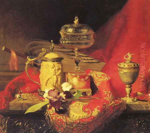 A Still Life With Iris And Urns On A Red Tapestry