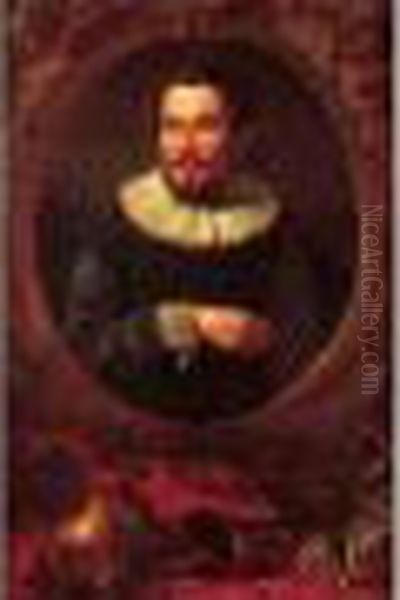 Trophee Militaire Devant Un Portrait De Gentilhomme Dans Un OEil De Boeuf Sculpte.