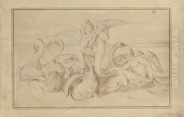 Cupid Making Music While Standing In Venus's Boat Pulled Byswans