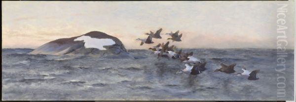 Bring the timeless beauty of Bruno Andreas Liljefors's Eider ducks flying near a cliff into your home with a handmade oil painting reproduction. Carefully recreated on canvas by skilled artists using traditional techniques, this piece captures the delicate brushwork, subtle light, and vibrant color of the original masterpiece. With museum-level quality and rich texture, it brings elegance and artistic depth to any space. Enjoy free shipping and make this masterpiece a part of your personal collection.