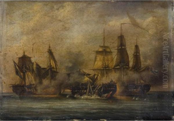 Combat Naval Huile Sur Carton Signe En Bas A Droite - Beau Cadre Debois Stuque Dore 29.5 X 42 Cms Titre Au Dos Belle Defense De Lafregate La Pomone Commandee Par Le Marechal Rosamel