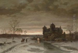 Winterliche Seeuferpartie Mit Schloss Und Figurenstaffage