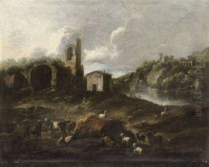 An Italianate River Landscape With Herdsmen Watering Their Cattle, A Ruined Arch Beyond