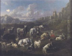 A Mountainous Landscape With A Drover Guarding His Goats, Sheep And Cows By A River